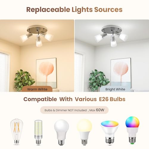 Dimensions & Bulb Requirements: The fixture size is 10″ x 10″ x 5.11″ (25.4cm x 25.4cm x 12.98cm) with a product weight of 2.25 lbs (1.02kg). It supports 3 bulbs, each up to 40W (maximum wattage 60W). This fixture is compatible with E26 base bulbs (bulbs not included).