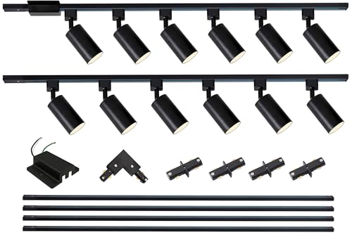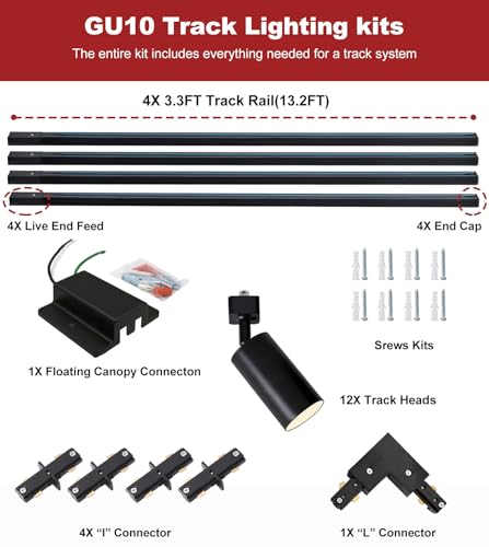 Package Includes: Track light complete kit includes 12 GU10 track lighting heads, 4*3.28ft H track lighting rails with live end feed and end cap, 4 mini “I” connectors, one “L” connector and H track Floating Canopy Connector, The floating canopy connector allows you to supply power from anywhere along the track without the need for additional wiring