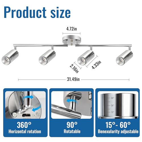 【Multi-function Track Lighting kit】: Track lighting fixtures is a versatile solution with 4 adjustable track lighting heads. Each track light head can rotate horizontally 360° and vertically 90°, Track lights Voltage 120V,allowing you to precisely illuminate specific areas or adjust the projection angle of the light, providing personalized lighting effects.