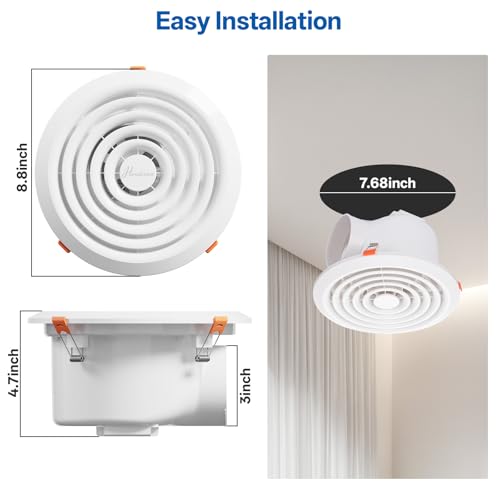 【Important Installation Note】Before purchasing, please ensure your ceiling opening is 7.68 inches in diameter and your duct size is 3 inches in diameter. This ceiling exhaust fan comes with pre-installed wiring terminals but does not include a plug. It must be hardwired directly into your home’s electrical system.