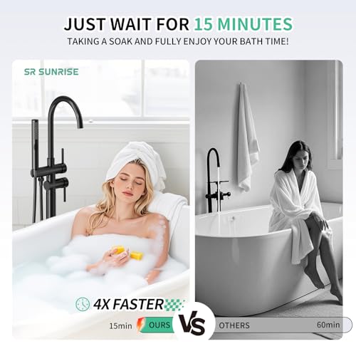 4GPM High Pressure Tub Filler: This high-pressure bathtub faucet fills your tub in no time, cutting filling time by 75% compared to others. In just 15 minutes, you can relax in your bath. Plus, the the CEC & DOE certified SR SUN RISE freestanding faucet uses less water than others, saving you money without compromising performance.