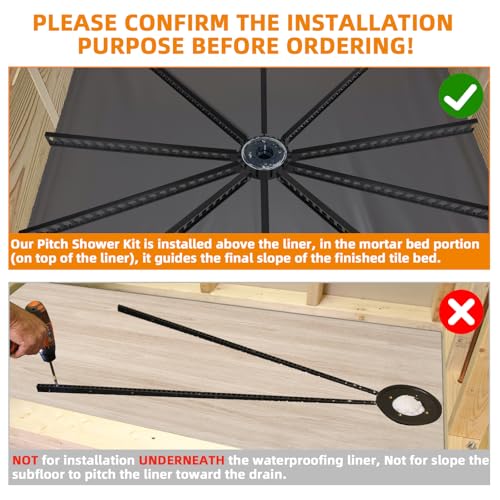 Fitment: The shower floor sloped tool sticks kit fits for standard 36 inch x 60 inch shower areas with central drainage outlets, as well as customized shower designs with drainage outlets within 36 inches of each wall.
