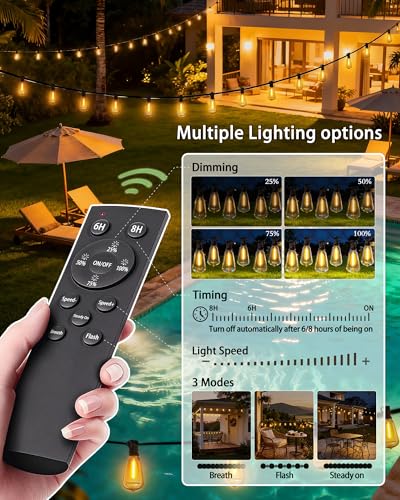 【Convenient Remote Control】Adjust brightness (25%/50%/75%/100%), set 6H/8H auto-off timer, and switch 3 lighting modes (Steady On/Breathing/Flashing) with the included remote. No extra dimmer or app—effortlessly customize your outdoor string light ambiance.(Warm Tip: AAA Batteries are not included, Please supply your own.)