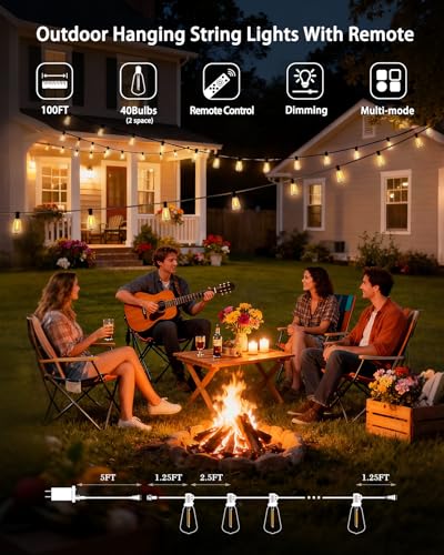 Outdoor String Lights Dimmable Waterproof with Remote, 100FT 38+2 Shatterproof ST38 Edison LED Bulbs Hanging Outside Light for Patio, Backyard, Porch, Deck, Balcony, Garden