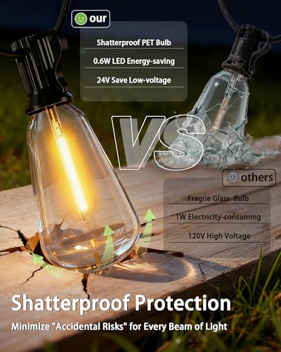 【All-Weather Durability & Shatterproof】Upgraded double-layer wires with reinforced PVC coating stand long-term outdoor wear, easily handling humidity, wind, fog, rain, snow and temperature fluctuations. Shatterproof PET bulbs are lightweight, drop-resistant, safe and intact if knocked over.