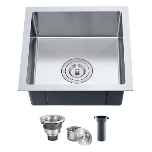 15 Inch Undermount Single Bowl Kitchen Sink, 18 Gauge 304 Stainless Steel Mini Bar Sink for Compact Kitchen & RV with X-Drain Groove & Noise Absorbing Pads,D15″xW15″xH6″