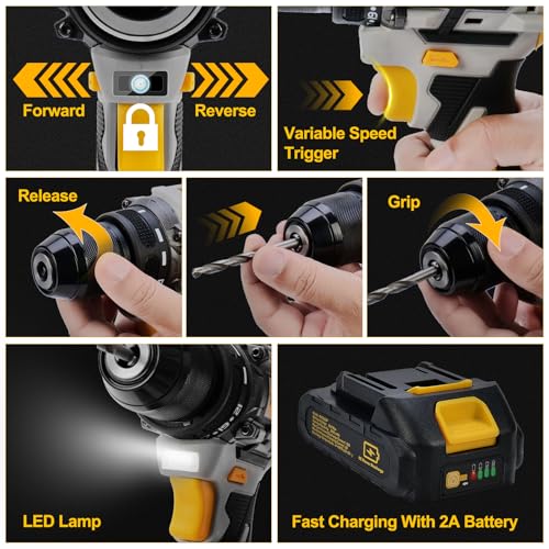 119 Pcs Cordless Drill Tool Kit Set; 20V Brushless Power Drill with 2.0Ah Battery, 10mm 3/8″ Keyless Chuck, 60N.M & 21+1 Torque Setting Power Tool Set for DIY Garden House Office Repai