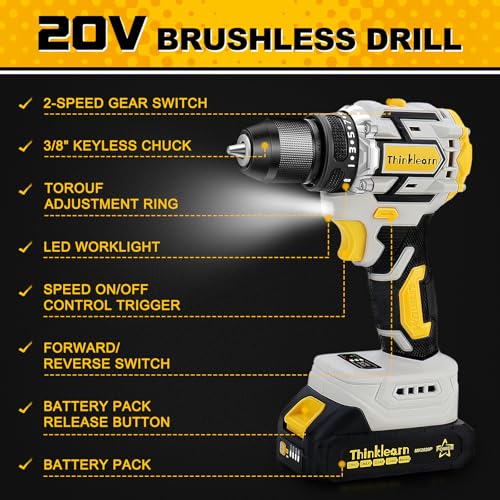 20V High Torque Brushless Drill – Thinklearn drill tool kit is equipped with 20V brushless drills. the cordless drills with advanced brushless motor technology can provide up to 60N.M of torque, which is much longer service life and higher efficiency than brush motors, and are equipped with a 21+1 clutch system and a 2-speed gear change function, Precise adaptation to various occasions