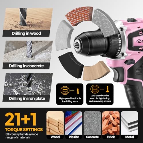 20V Cordless Drill, Electric Power Drill Driver with Battery Charger,Power Drill Set Tool for Women Pink Drill Set,3/8” Keyless Chuck, 2 Variable Speed