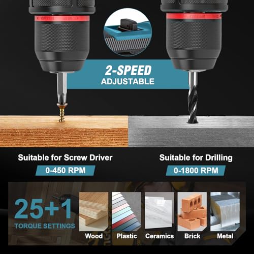 25+1 Torque Control & Dual Speed: With two speed settings, the high-speed setting is 0-1800 RPM, suitable for high-speed drilling, and the low-speed setting is 0-450 RPM, suitable for tightening or loosening screws; 25+1 torque control allows you to precisely control the powerful 575 inch-pounds of torque, easily handling any scenario.