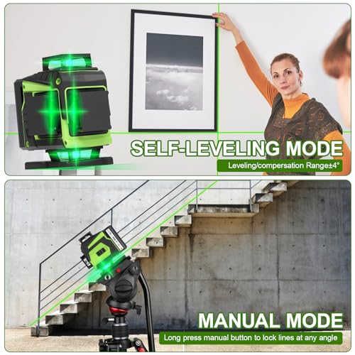 【Self-Leveling & Manual Mode】 ①Self Leveling Mode:If tilt angle≤4°, the self leveling laser level will automatically levels, otherwise it will continuously beep with sound alarm and laser will keep flashing.② Manual Mode: Hold down ”OUTDOOR”button (middle button) for 3 seconds could turn on the manual mode, you can project laser lines at any angle.meet your alignment needs from different angles.